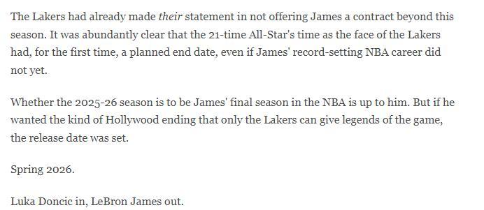 这样的做法更意味着,湖人不再将詹姆斯视为核心,甚至都不在球队未来计划了。按理说,詹姆斯好歹为湖人夺得了一个总冠军,即便他不是NBA历史最伟大的球星,但也是历史前三级别的伟大巨星,而且有着历史得分王的伟大荣誉。他却连一个卖队提前通知的待遇都没有。